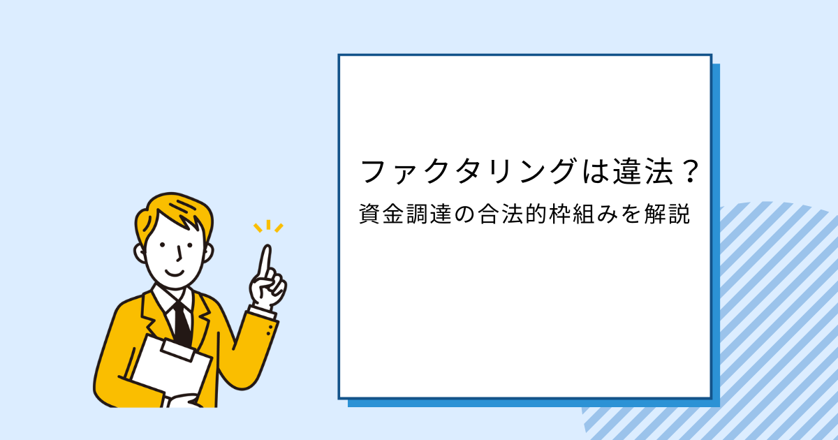 企業の資金調達方法として、ファクタリングは違法ではないか?と一部で誤解を受けることがありますが、実は法律に基づいた全く合法的な手段です。 この記事では、ファクタリングがなぜ合法なのか、その法的根拠について詳しく解説し、違法なファクタリングとの違いを明らかにします。 ファクタリングの法的根拠 ファクタリングは売掛債権の買取りサービスであり、入金前の請求書を売却することにより、手数料を引いた金額が即座に入金されます。 重要なのは、ファクタリングが債権の「売買契約」であり、融資やローンとは異なる「借入」ではない ...